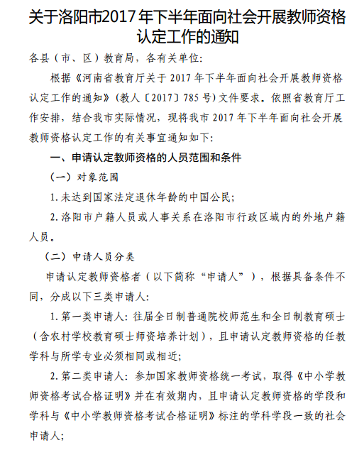 关于洛阳市2017年下半年面向社会开展教师资格认定工作的通知